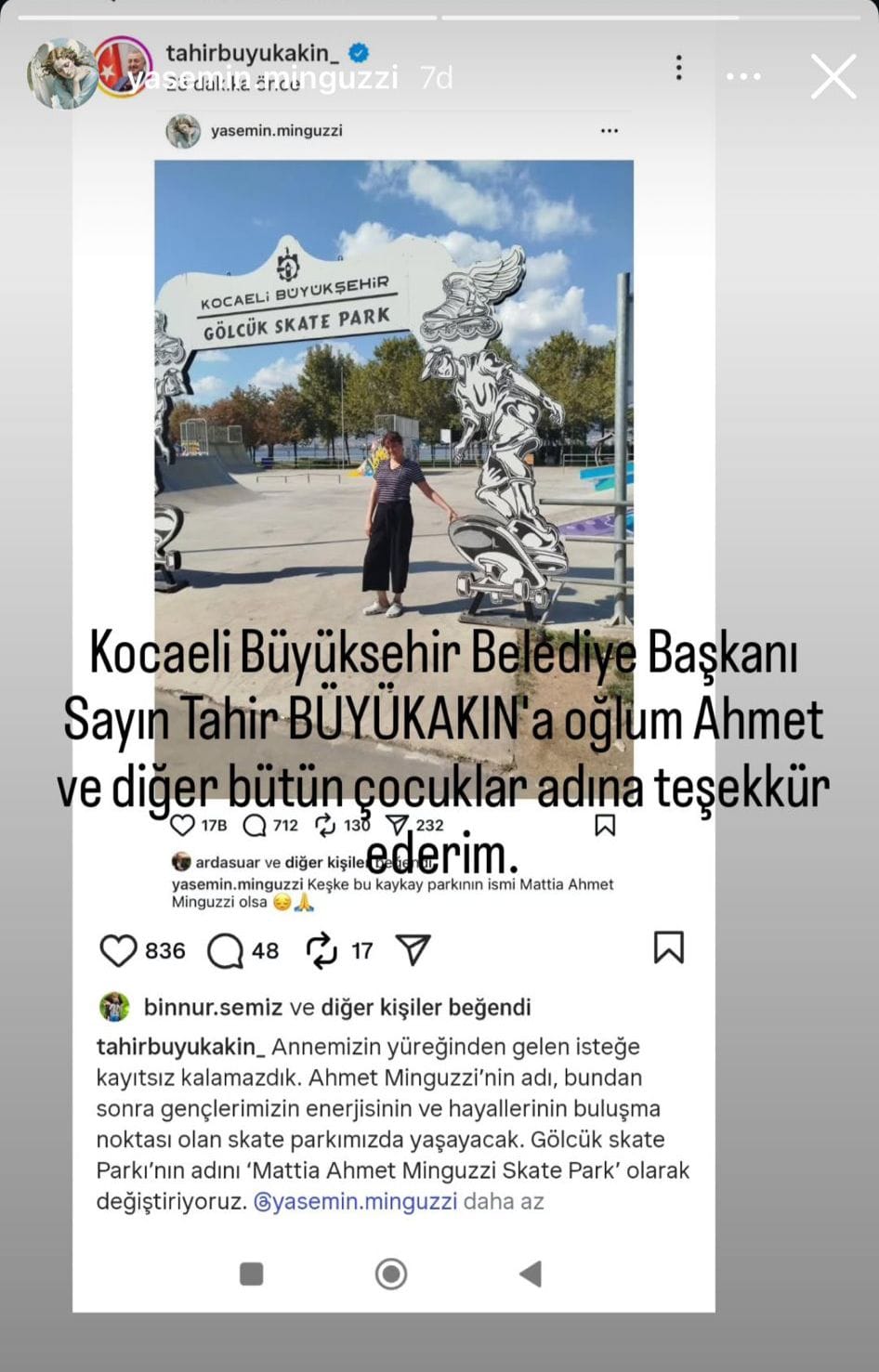 Kocaeli Büyükşehir Belediye Başkanı Doç.Dr.Tahir Büyükakın, Gölcük Skate Park'a Mattia Ahmet Minguzzi adını vereceklerini açıkladı. Anne Yasemin Minguzzi, bu duyarlı davranışı ve oğlunun adını Kocaeli’de yaşatacak olmasından dolayı Başkan Büyükakın’a teşekkür etti.