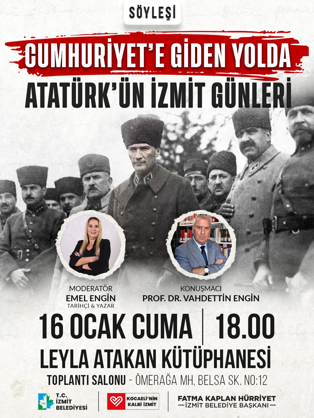 16 Ocak Cuma günü saat 18.00’de Leyla Atakan Kütüphanesi Çok Amaçlı Toplantı Salonu’nda düzenlenecek programda; Gazi Mustafa Kemal Atatürk’ün bölgedeki askeri incelemeleri, diplomatik sürecin devam ettiği bir dönemde kamuoyuna İzmit üzerinden verilen mesajlar ve halkla yüz yüze kurulan doğrudan iletişim ele alınacak. Söyleşide, tüm bu başlıklar basının üstlendiği sorumluluk çerçevesinde değerlendirilecek.