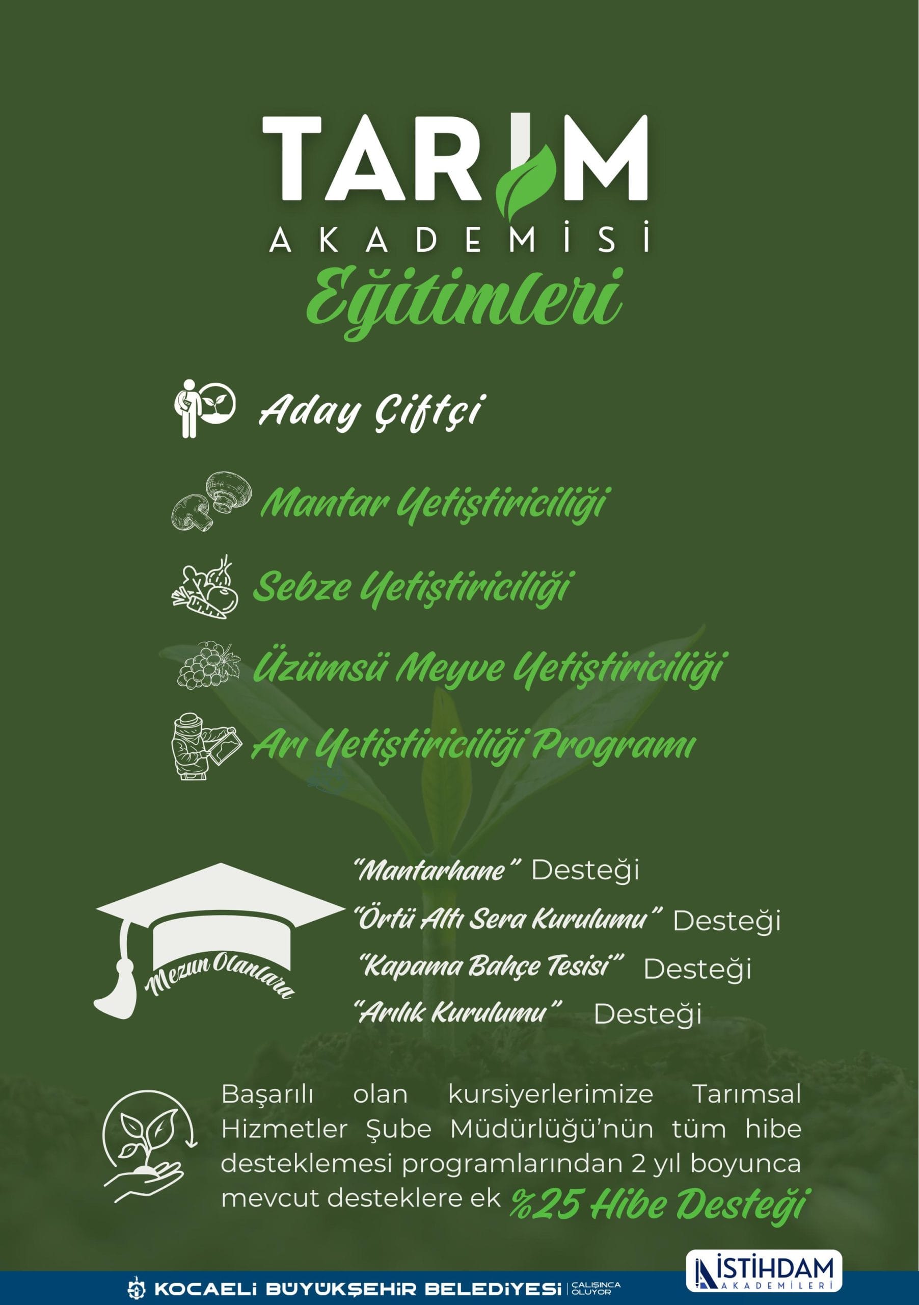Tarım Akademisi, tarım alanında temel bilgiye sahip çiftçi kayıt sisteminde kayıtlı olan kursiyerlere daha ileri düzey eğitim vererek uzmanlık kazandırmayı hedefliyor. Eğitimler arasında “Aday Çiftçi Eğitimi”, “Arı Yetiştiriciliği”, “Mantar Yetiştiriciliği”, “Sebze Yetiştiriciliği” ve “Üzümsü Meyve Yetiştiriciliği” gibi spesifik branşlar yer alıyor. Kocaeli Üniversitesi Arslanbey Yerleşkesi’nde kurulacak olan akademi; tarımsal üretim, bitki yetiştiriciliği, tarımsal teknoloji ve pazarlama gibi farklı alanlarda kurs ve uygulama saha imkânı sağlayacak.