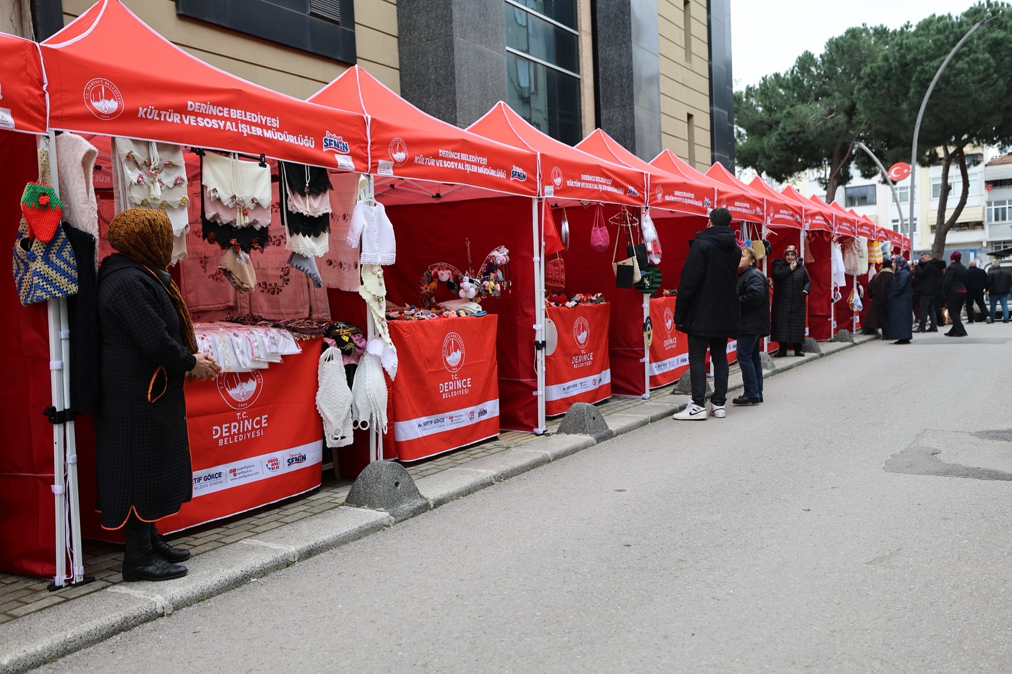 Kadınların üretime katılımını artırmak ve ürettikleri el emeği göz nuru eserleri daha geniş kitlelerle buluşturmaları amacıyla çeşitli projeler yürüten Derince Belediyesi, 14 Şubat Sevgililer Günü kapsamında anlamlı bir organizasyona daha imza attı. Daha önce yeni yıl öncesinde düzenlenen satış stantlarının ardından bu kez Sevgililer Günü temalı Alışveriş Günleri ilçe halkı ile buluştu. Çenedağ Mahallesi Şehit Nedim Küçük Sokak’ta (Derince Belediyesi Merkez Binası arka sokağı) kurulan stantlar, üç gün boyunca 11.00 – 19.00 saatleri arasında ziyaretçilerini ağırladı. Stantlarda el yapımı takılardan dekoratif ürünlere, örgü ve tekstil ürünlerinden hediyelik eşyalara kadar birçok farklı ürün sergilendi. Sevdiklerine anlamlı ve özel hediyeler almak isteyen vatandaşlar stantlara ilgi gösterirken, stant açan üreticiler de ürünlerini doğrudan tüketiciyle buluşturmanın memnuniyetini yaşadı.