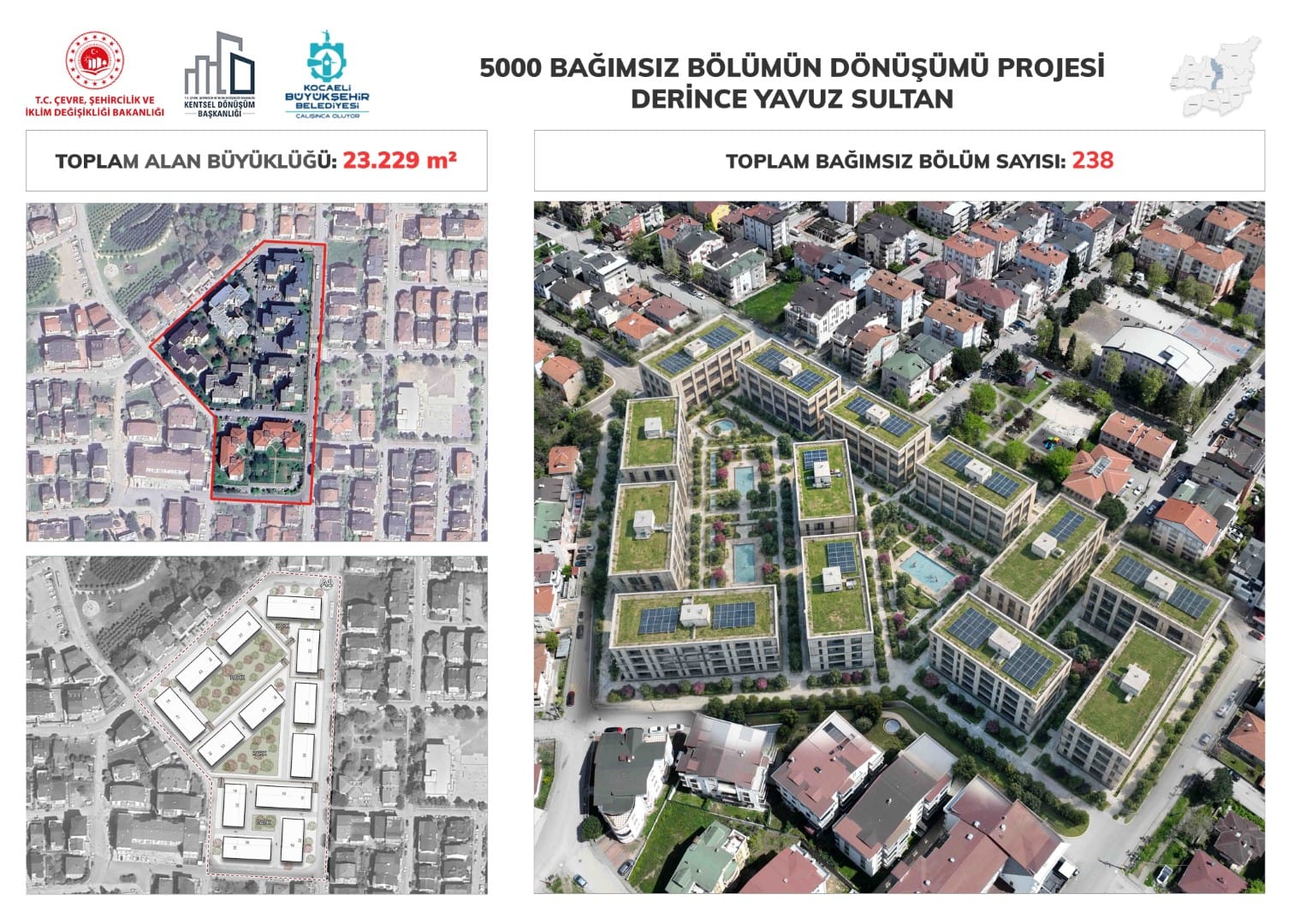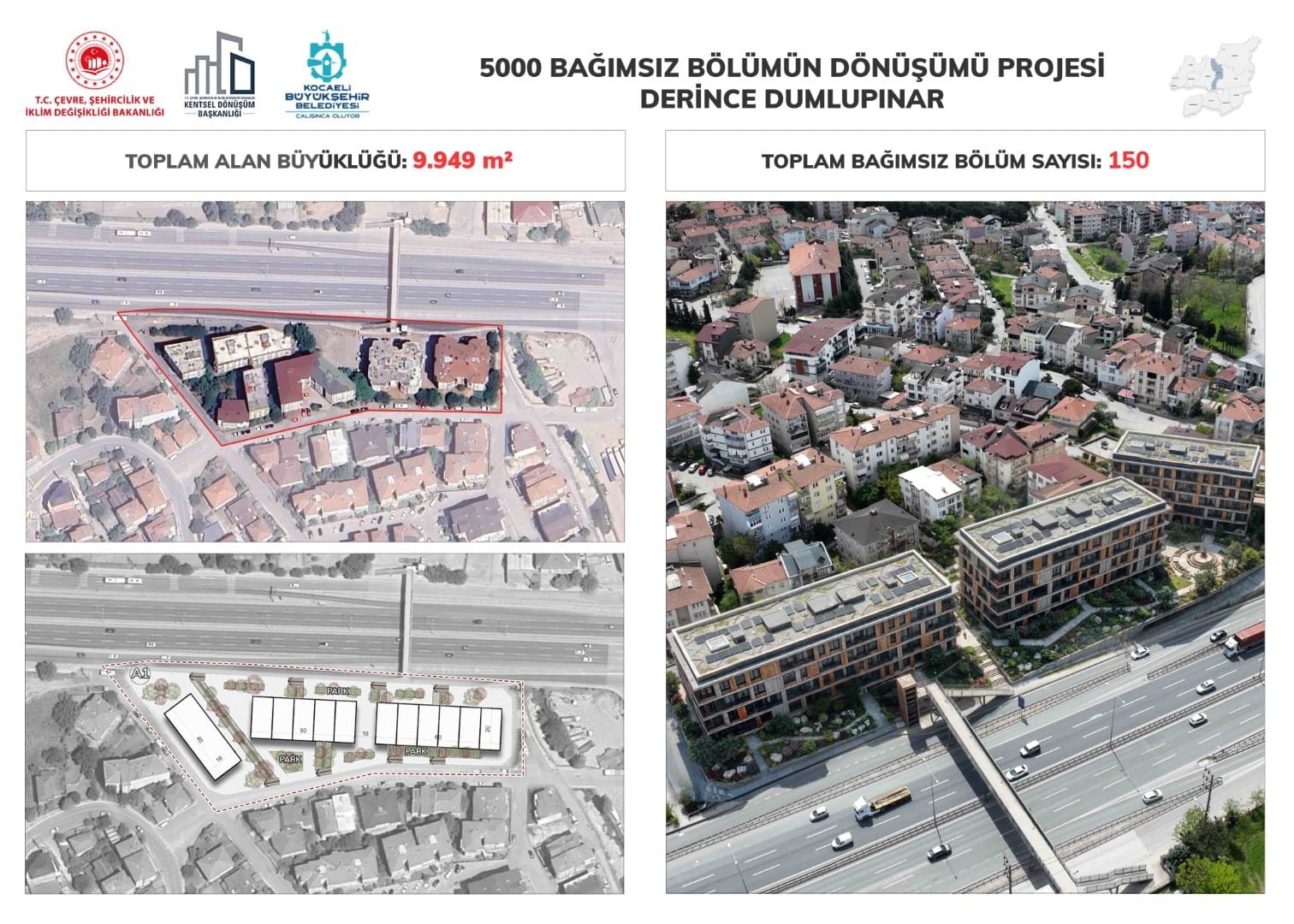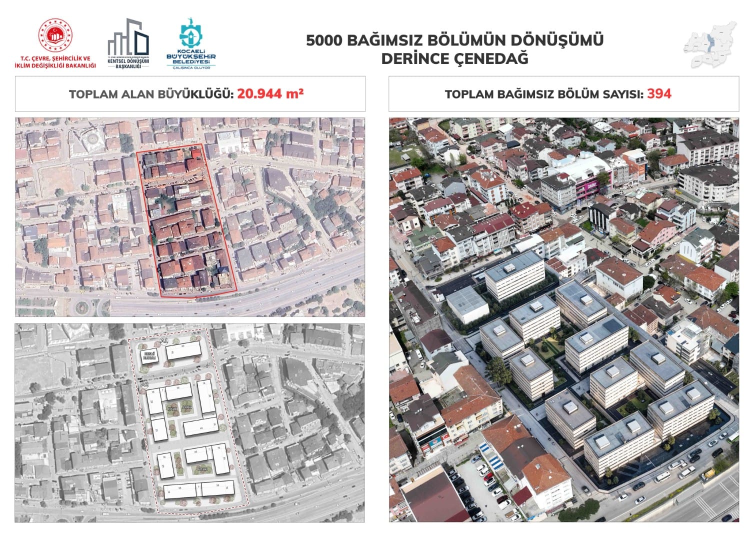 Çenedağ’da, eski Derince Postanesi’nin de içinde bulunduğu 20.944 metrekarelik alanda toplam 394 bağımsız birim dönüştürülecek. Ayrıca Dumlupınar Mahallesi’ndeki 9.944 metrekarelik alanda 150 bağımsız birim, Yavuz Sultan Mahallesi’ndeki 24 dönümlük alanda da 238 bağımsız birim dönüştürülecek. Derince’deki, çalışma yapılacak toplam bağımsız birim 782 olacak. Yapılacak kentsel dönüşüm çalışmaları ile birlikte Derince adeta yeni bir çehreye kavuşacak.