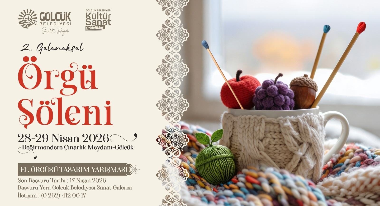 Gölcük Belediyesi kültür ve sanat etkinlikleri kapsamında bu yıl ikincisi gerçekleştirilecek olan Geleneksel Örgü Şöleni, 28-29 Nisan 2026 tarihlerinde Değirmendere Çınarlık Meydanı’nda kapılarını açacak. “Sanata Değer” sloganı ile sanatı ve sanatçıya yönelik desteklerini sürdüren Gölcük Belediyesi, ikincisini düzenleyeceği şölen ile geleneksel el sanatlarını yaşatarak, yeni nesillere aktarmayı hedefliyor.