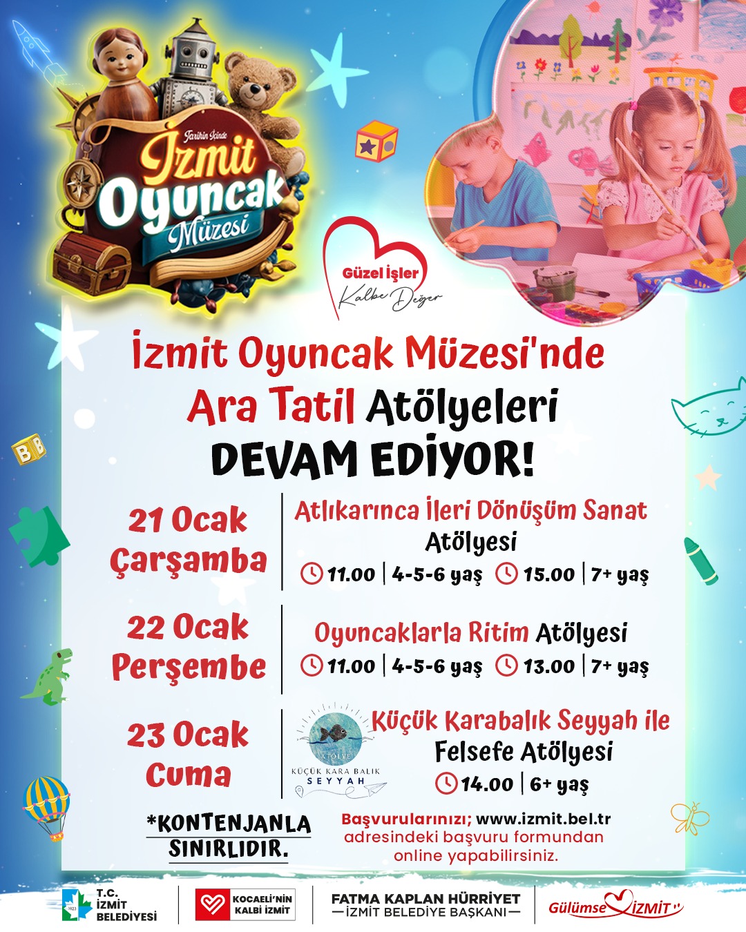 İzmit Belediyesi Oyuncak Müzesi, ara tatilde çocuklar için eğitici ve eğlenceli atölye çalışmalarına ev sahipliği yapacak. 21–25 Ocak tarihleri arasında düzenlenecek atölyelerde çocuklar; sanat, müzik, felsefe ve el becerilerine yönelik etkinliklerle keyifli bir tatil geçirecek. Başvurular izmit.bel.tr adresindeki başvuru formundan yapılabilecek.