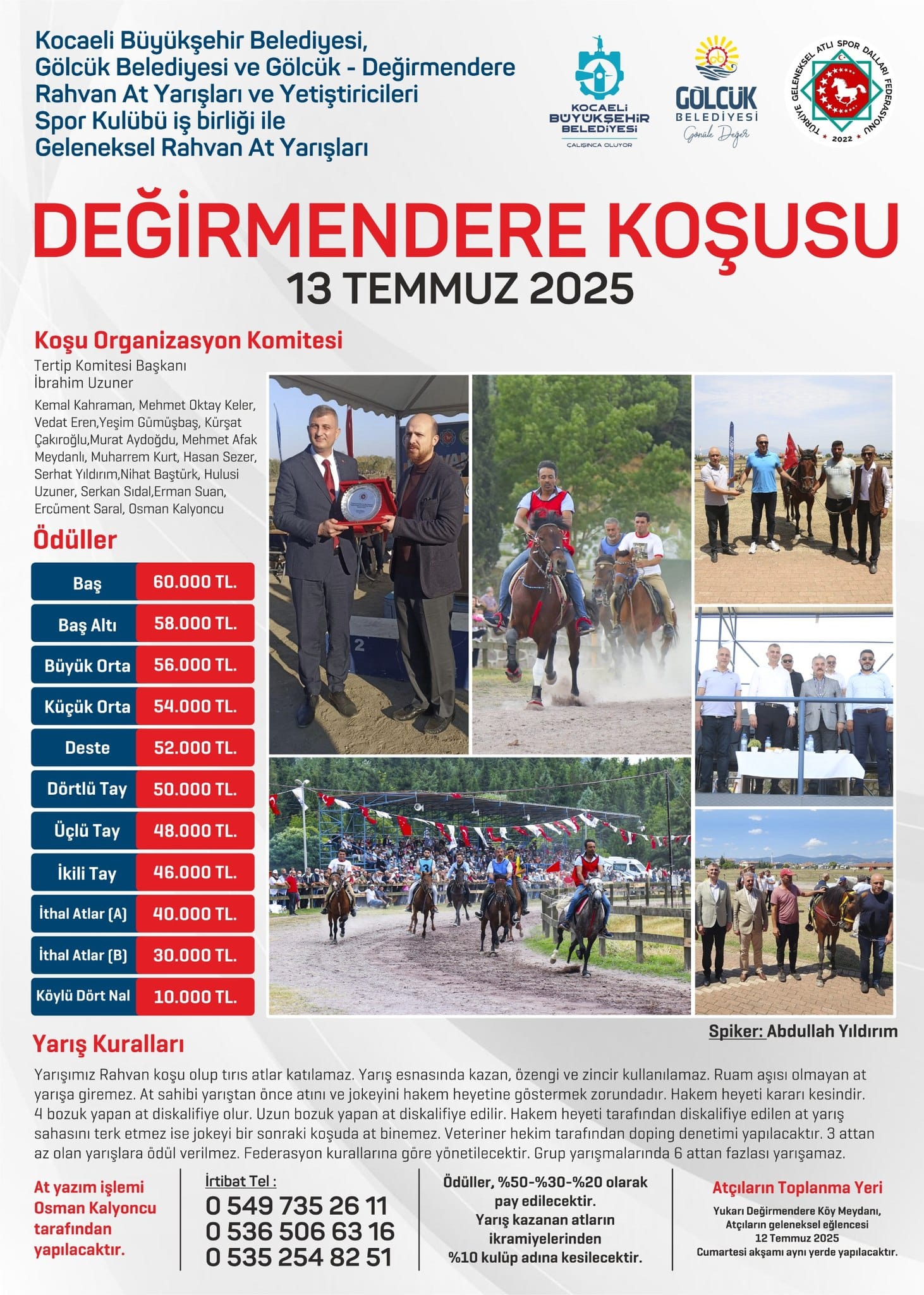 Gölcük Belediyesi, geleneksel Rahvan At Yarışları’nın heyecanını yine yaşatmak için ev sahipliğini yaptığı Değirmendere Koşusu için hazırlıklarını tamamladı. Türkiye Geleneksel Spor Dalları Federasyonu, Kocaeli Büyükşehir Belediyesi, Gölcük Belediyesi ve Gölcük Değirmendere Rahvan Atçılar Kulübü işbirliğiyle düzenlenen Geleneksel Rahvan At Yarışları Değirmendere Koşusu’nda heyecan, 13 Temmuz Pazar günü yaşanacak. Gölcük Rahvan At Bakım ve Konaklama Tesisi Koşu pistinde saat 10.00’da başlayacak yarışlar, Türkiye’nin dört bir yanından gelen rahvan at yarışçılarının mücadelesine sahne olacak.
